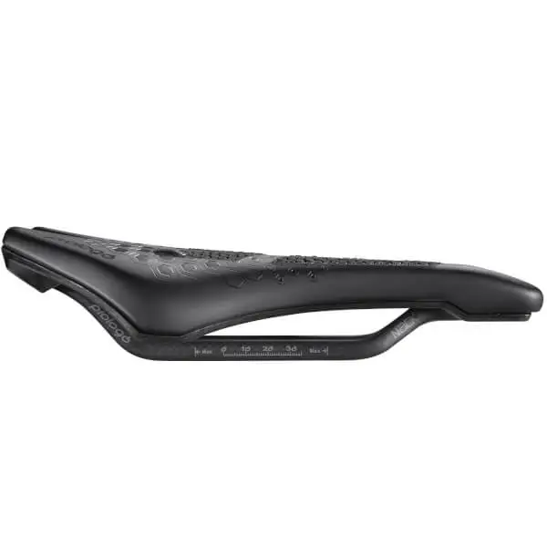 Dimension TRI is a saddle born for triathlon and time trial user The saddle size is 245mm long and 143mm wide, the Nack version weighs 191 grams. This range designed for triathlon and time trials guarantees excellent performance, improving comfort in all pedaling phases thanks to the ergonomic “V SHAPE” shape, in combination with the new PAS channel, modified in width and depth. These devices guarantee a better blood flow eliminating numbness and excessive pressure in the genital / prostatic area. In the versions with CPC technology the “slips” are also eliminated, improving the stability of the athlete and guaranteeing better aerodynamics. The tests carried out on the track and in the wind tunnel with some of the most important professional teams in the world, confirmed an improvement in performance of 5-8% Foams with variable density, increased by 15% in the upper part and on the tip of the saddle, allow to increase the support surface, dissipating the pressures homogeneously, as well as guaranteeing a greater support area for the antero-ischial area, especially in the maximum aerodynamic position. Features: The sitting area has been advanced by 2cm Seat tip is wider than 7mm Use of variable density foams to increase stability and comfort; The versions with CPC technology eliminate slipping and improve the aerodynamic positioning of the athlete; Tech Specifications: Size: 245x143mm Rail: Nack Carbon 7×9.3mm Cover: Microfibre Padding: Light Foam Weight: 191g