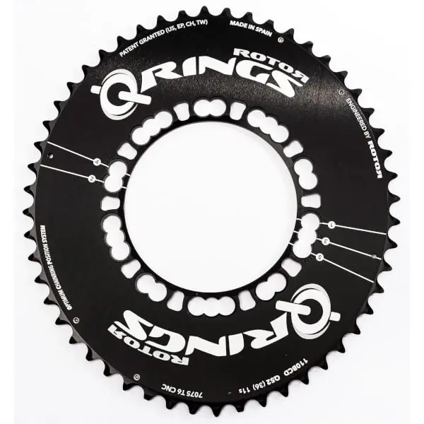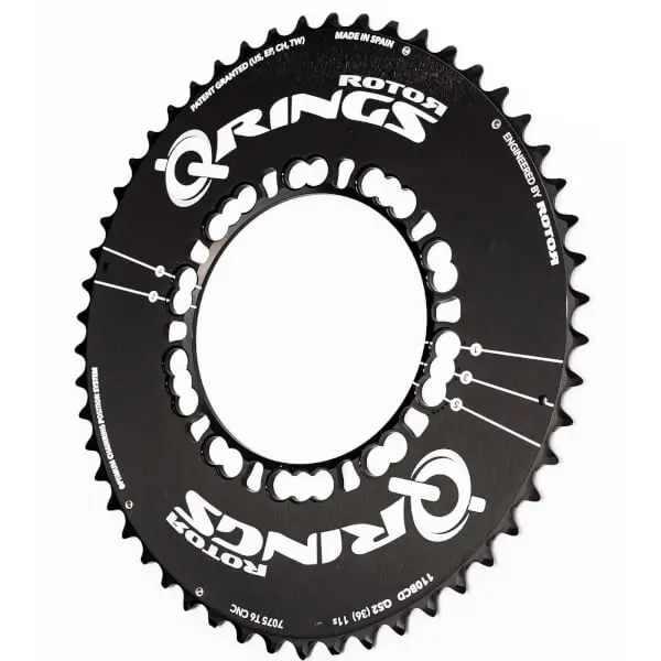 If looking as fast as you feel influences the way you ride, then our wind-shucking aero Q-Rings with a 110BCD allow you to orient your chainrings around your riding style…literally. Q-Rings were designed to boost your cycling performance by varying drivetrain resistance inline with your legs´ natural strengths and weaknesses when pedaling. 5 Optimum Chainring Positions (OCP) allow you to fine-tune your improved riding experience by orienting your chainrings around the most productive part of your pedal stroke. Subtle but efficient 10% ovality and compatible with your compact 110BCD cranks, aero Q-Rings work with your body´s biomechanics to yield maximum efficiency and enable you to go further and faster with less fatigue. Features: 100% CNC-machined, 7075-T6 aluminum alloy Aero design: reinforced rigidity and aerodynamics Steel shifting pins 5 OCP points (4 points in 50/34) Designed to work with all 9, 10 and 11 speed groupsets Some cranks require specific Q-Rings Specifications:Color: NoNumber Of Teeth: 34, 36, 38, 39, 42, 44, 46, 50, 52, 54, 55, 56Bcd: 110 mmTechnologies: Aero, Alu7075, CNC, OCP, TryQQring Type: Inner, OuterCompatibility: NoDiscipline: Road, Triathlon