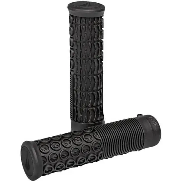 The Thrice grip borrows the same integrated 1 piece clamp and tapered core as our proven Slater grips, which keep both the weight and price down. It’s packed full of technical features and a soft gel compound to ensure complete bar control and ultimate comfort. First, we utilized a half mushroom profile for palm comfort. Next, we added our proven circular icon dampeners to disperse shock and vibrations. And finally, we incorporated our ramped and undercut saddle icon to aid in finger traction, which reduces any hand slippage in the toughest conditions. The Thrice has an ovalized shape and is offered in two different diameters to ensure the right fit for your hands.