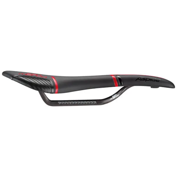 The Aspide Racing saddle is designed for riders who are wanting excellence in performance and great comfort when cycling. The cut-out also ensures better pain relief and perfectly balances rider support in many different seating positions. Aspide is perfect for riders who prefer a fixed seated position, when riding on the flat but push back into the saddle on climbs to generate more power. The relief channel which goes all the way over the nose ensure more comfort in aggressive race positons. An absolute race-bred all-rounder. Xsilite Rails It is a material with a high percentage of silicon with particles of titanium and carbon. Light and strong, it turns out to be resistant to all weather conditions. The process through the stealth technology ensures a better strength against fatigue stress. Carbon Fiber Reinforced Shell Nylon with high properties, enriched with a high proportion of long carbon fibre, in order to reinforce the characteristics of rigidity, stiffness and durability without compromising the weight. Biofoam Biodynamic structure that follows the movements of the pelvis during pedalling, guarantees comfort, reduced weight, lasting resistance and ideal support. The “closed cells” surface ensures water is repelled from the padding. Microfeel Cover Breathable and hard wearing cover. It is lighter than traditional materials and less deformable. Anti-skid effect with an extraordinary grip on the saddle. Biocompatible material. New Ergonomy Perfect balance between support zone and relief zone. The “big hole” helps maintain comfort under pressure and offers day long support and comfort: the central relief zone is long enough to work in all riding positions but a structural stability bridge prevents unwanted flex and twist. Specifications: Rail: Xsilite Shell: Carbon Fibre Reinforced Padding: Biofoam Cover: Microfeel Size Narrow: 277 x 132mm Size Wide: 277 x 142mm Weight: 177g / 180g Saddle Profile: Open / Waved Colours: Black/Black, Black/Red
